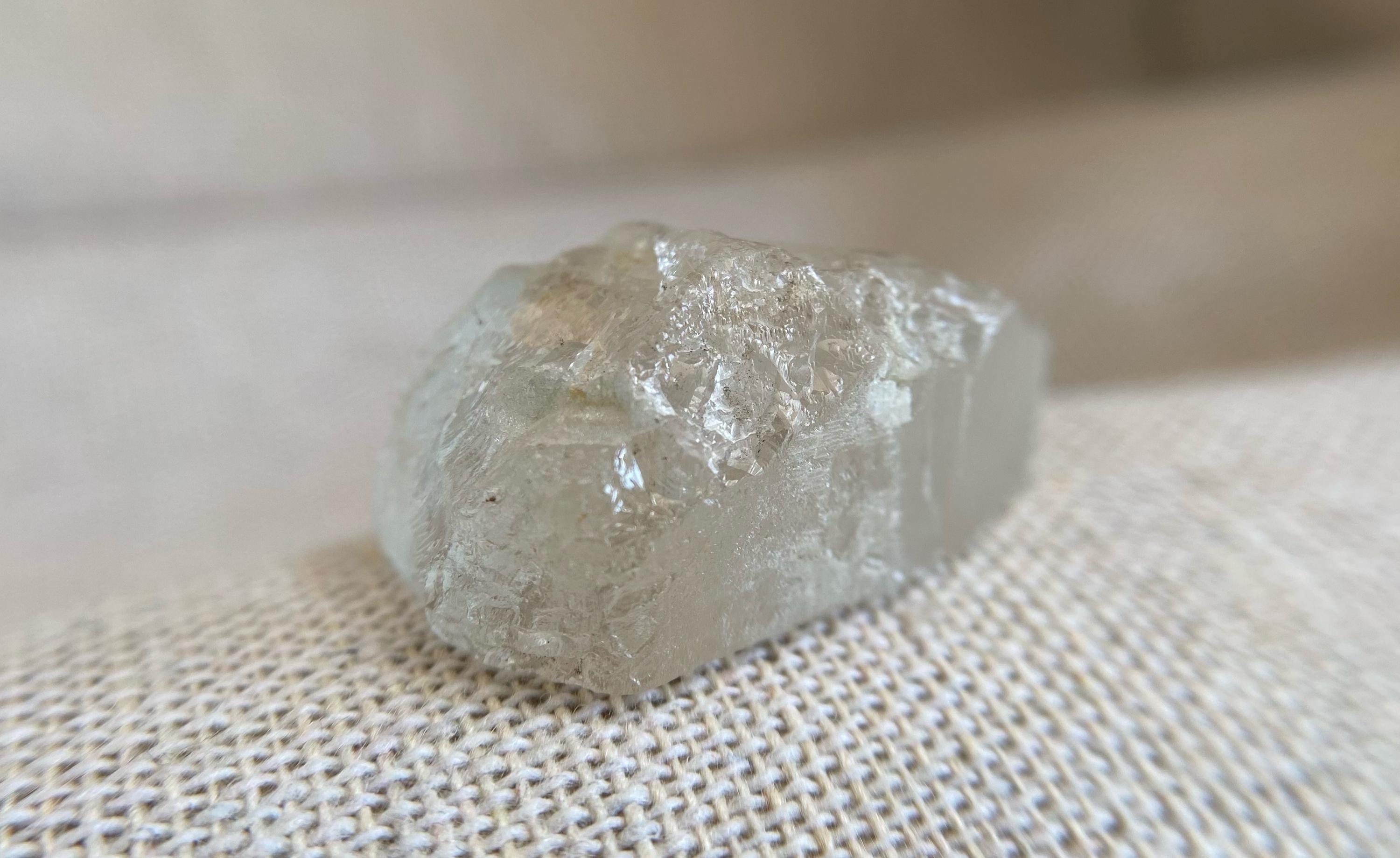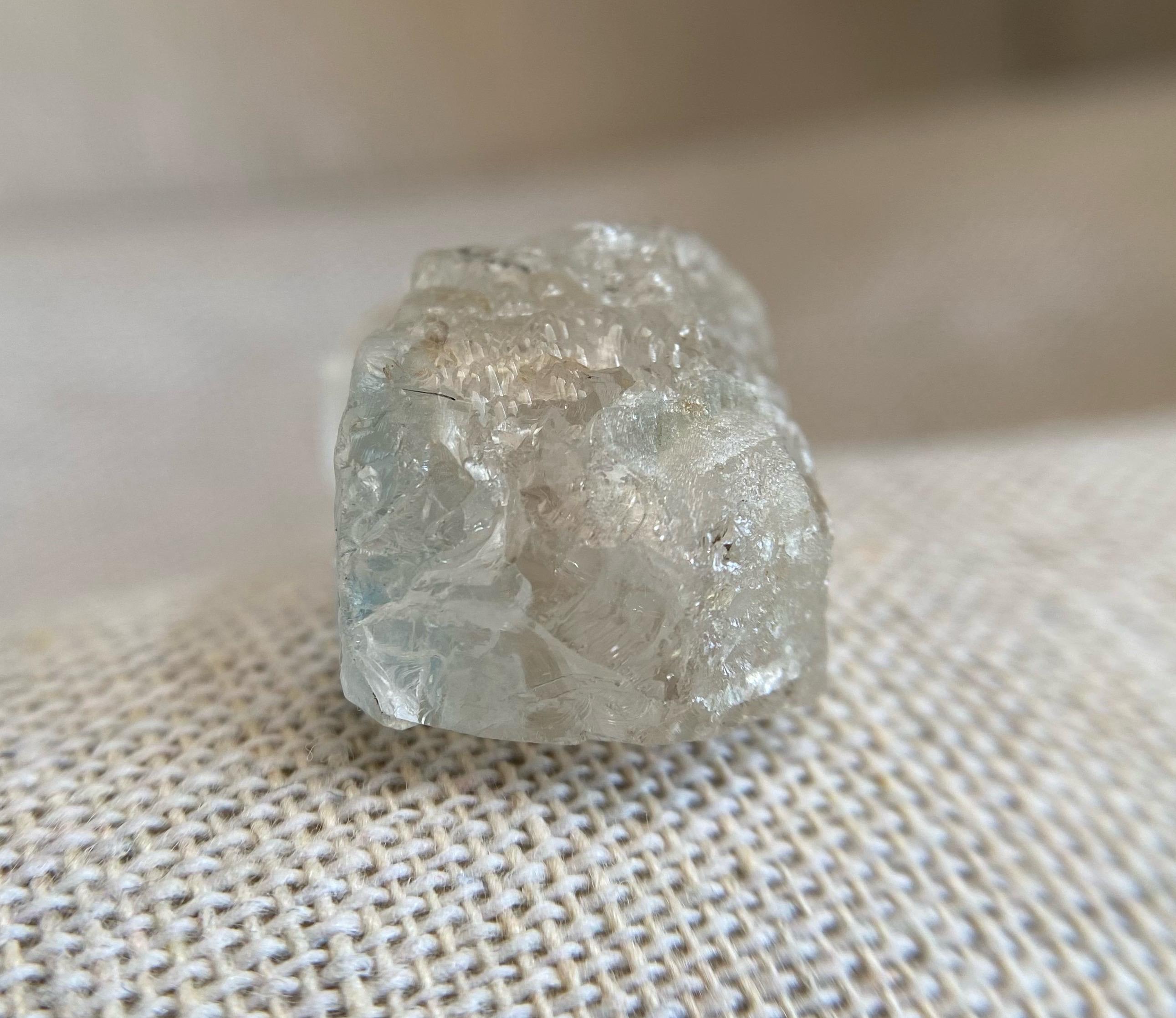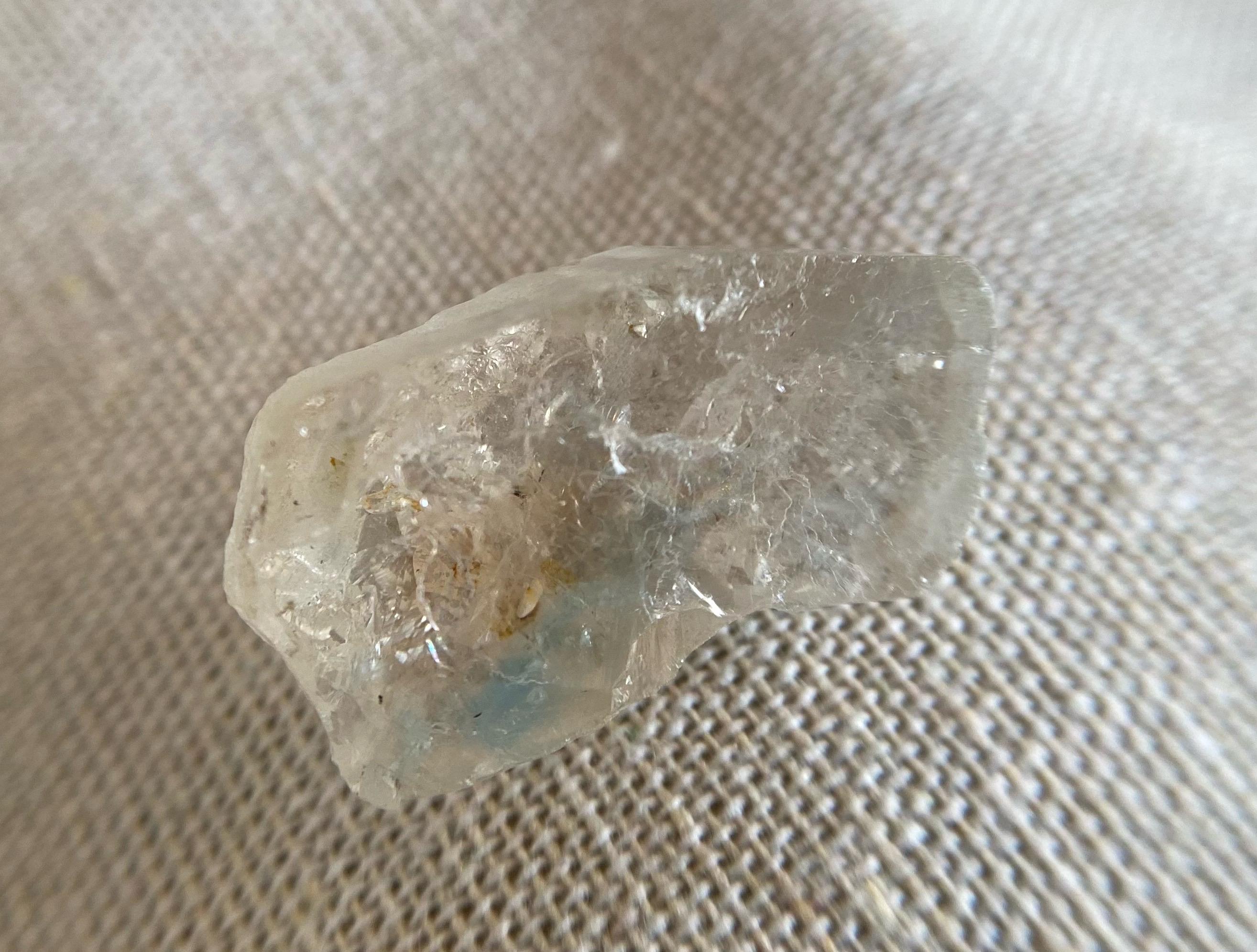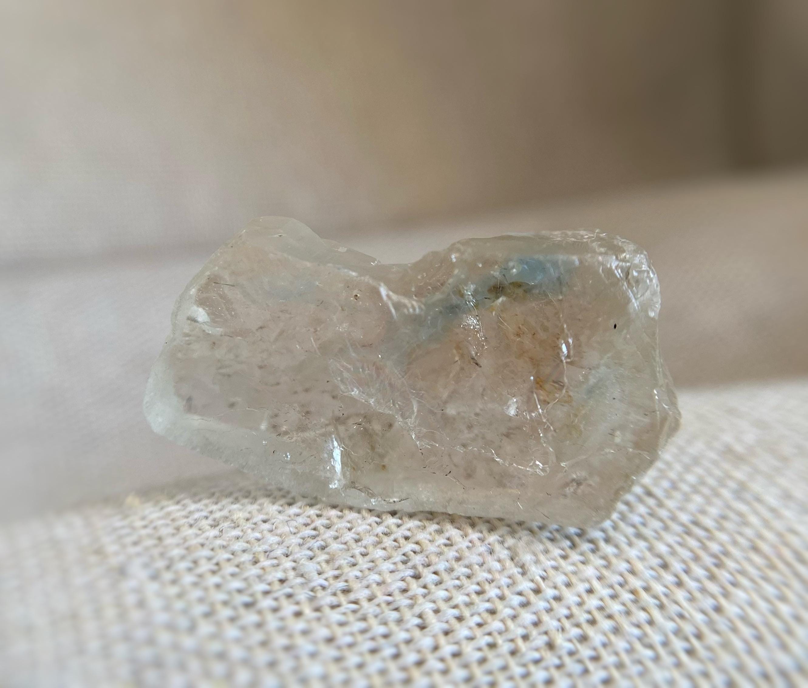 An elegant natural crystal featuring high transparency and a delicate blue vein running through its structure. Its purity and soft hue create a sense of lightness and airiness.