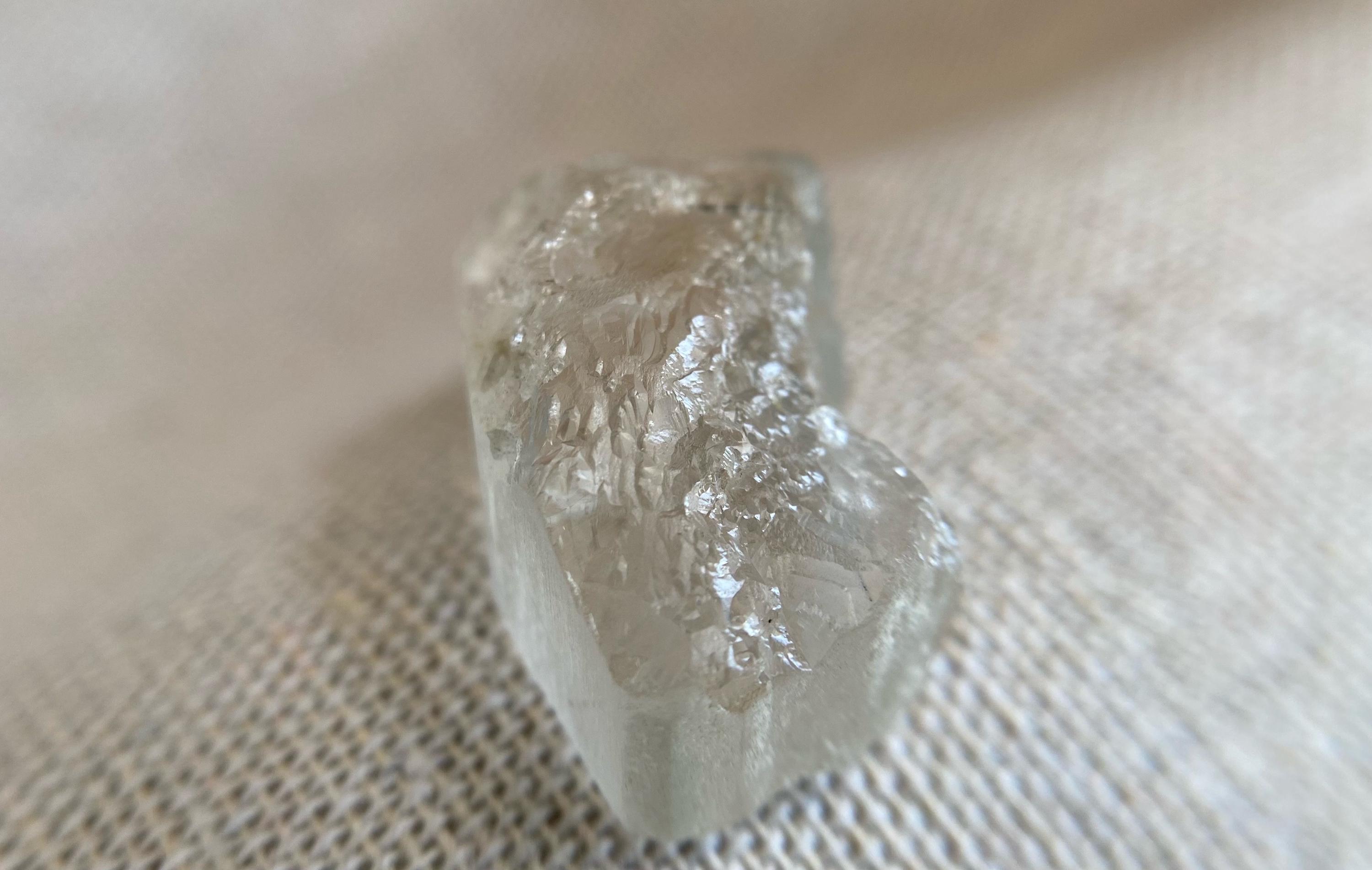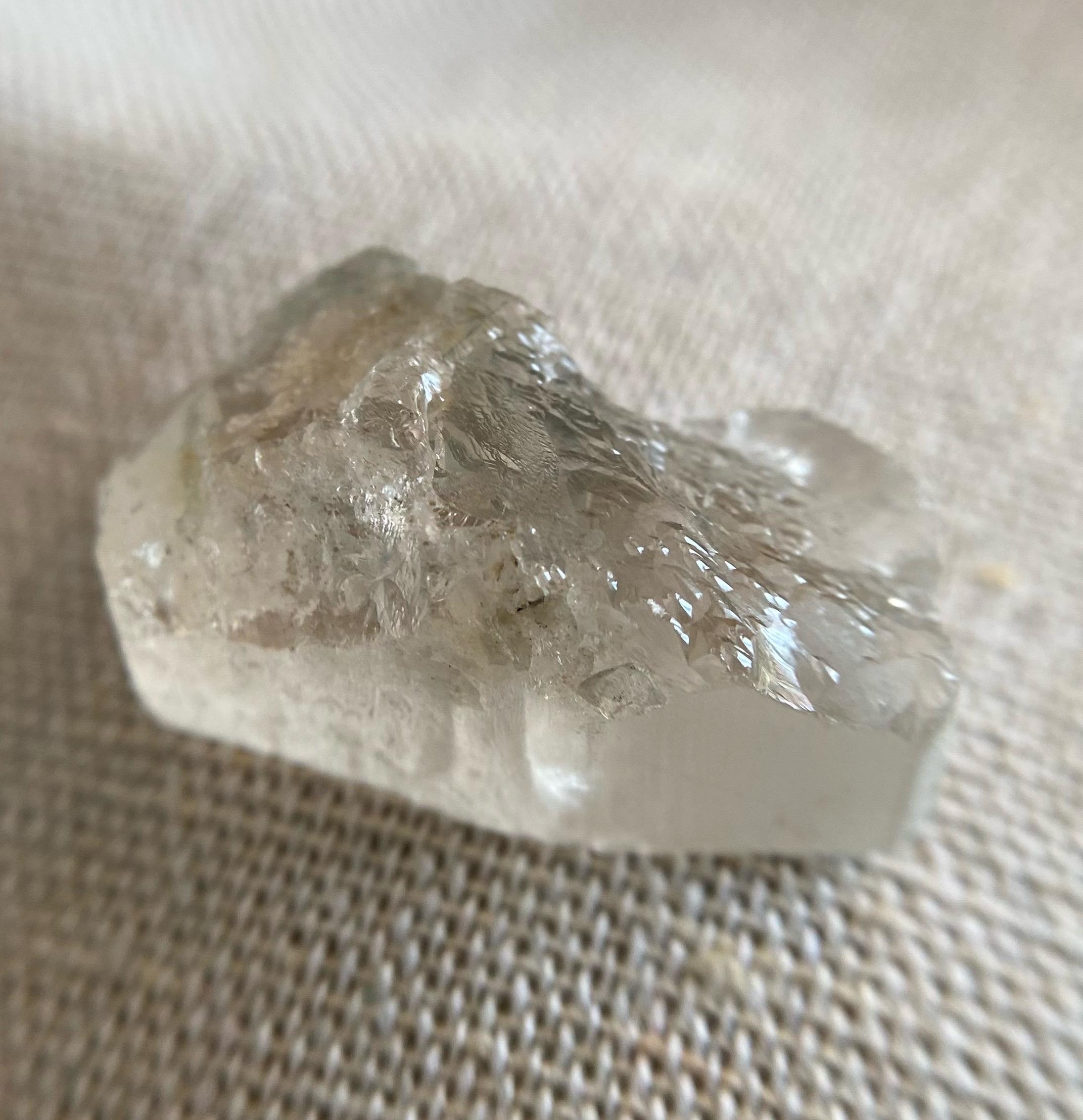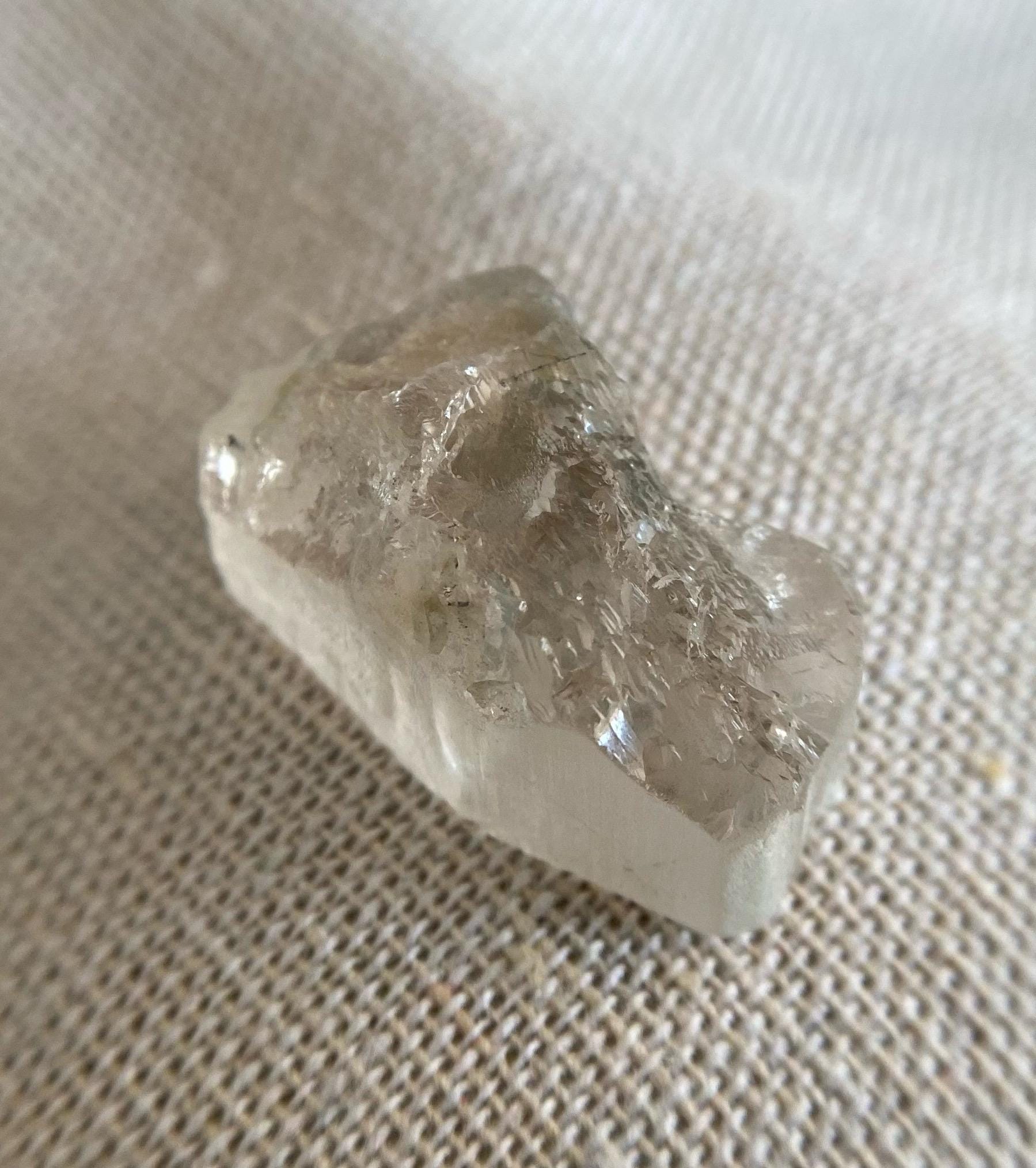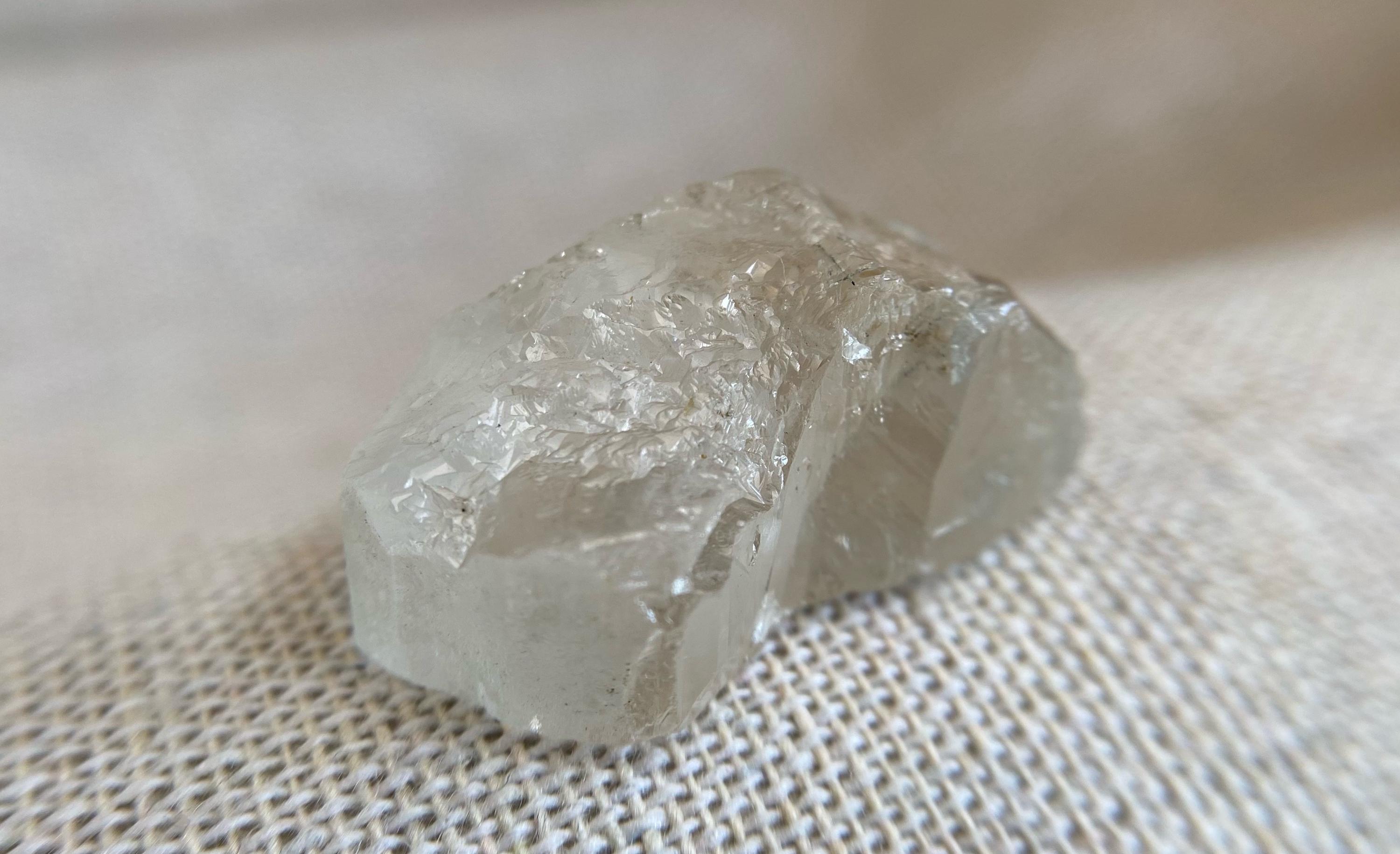 An elegant natural crystal featuring high transparency and a delicate blue vein running through its structure. Its purity and soft hue create a sense of lightness and airiness.