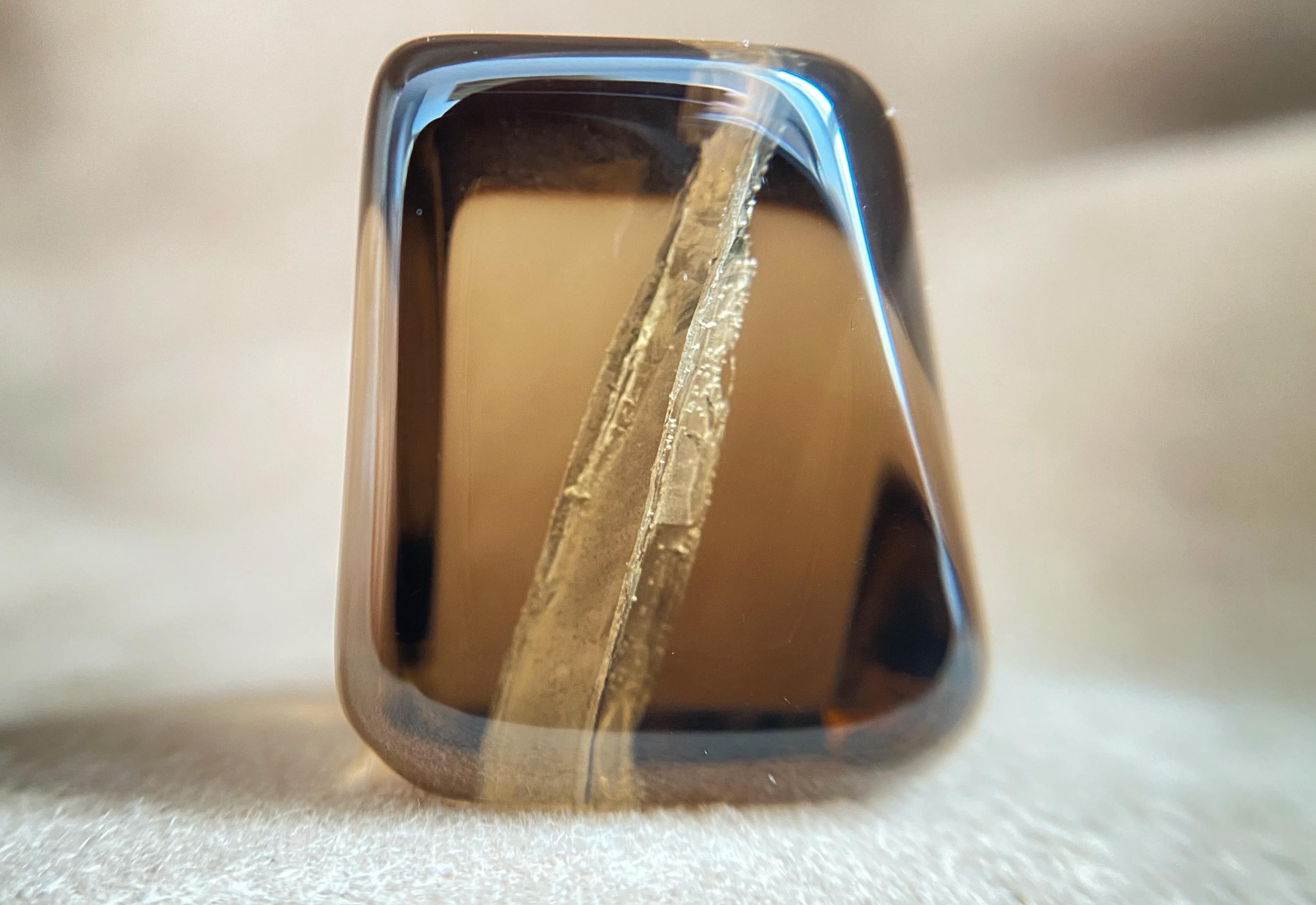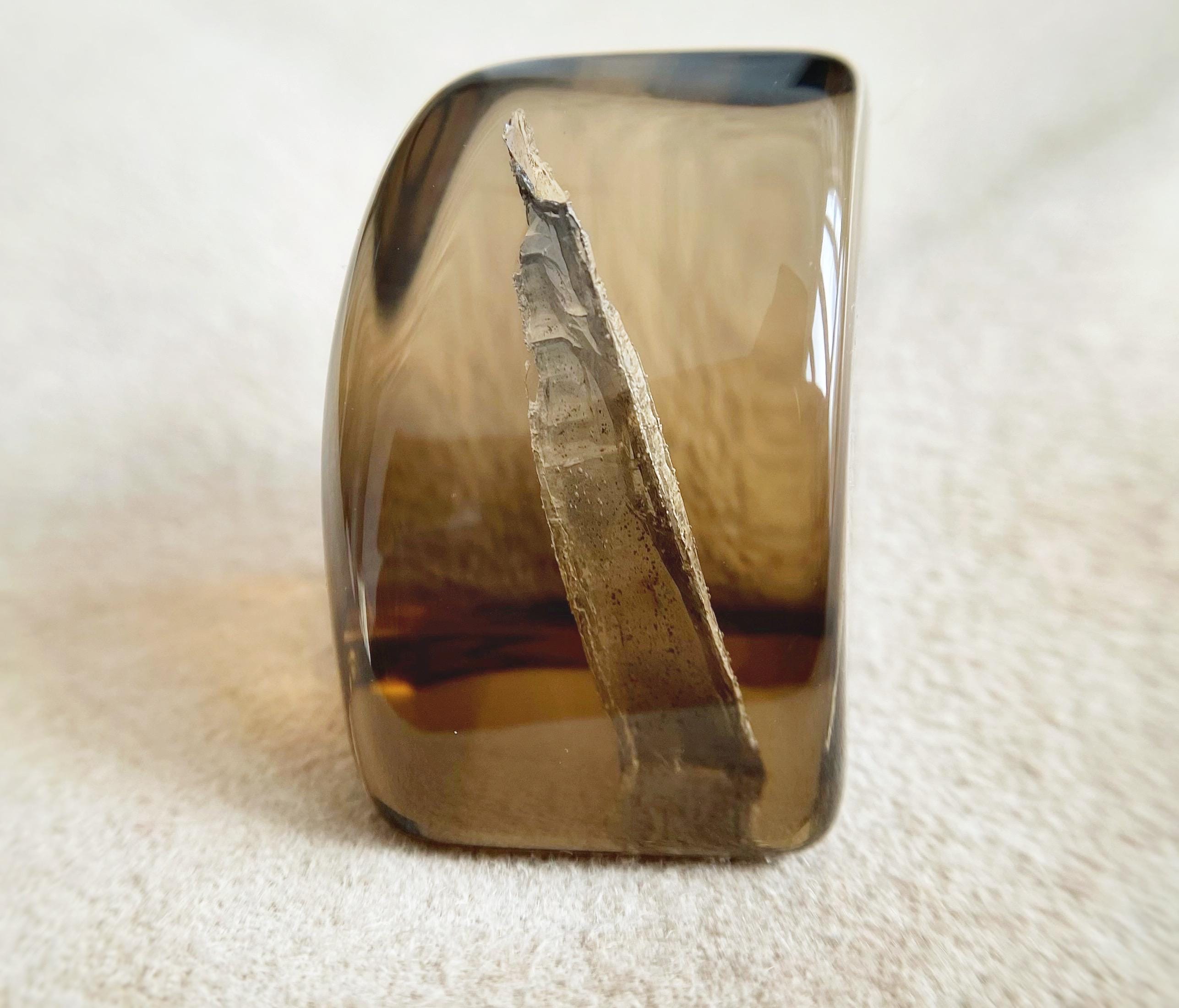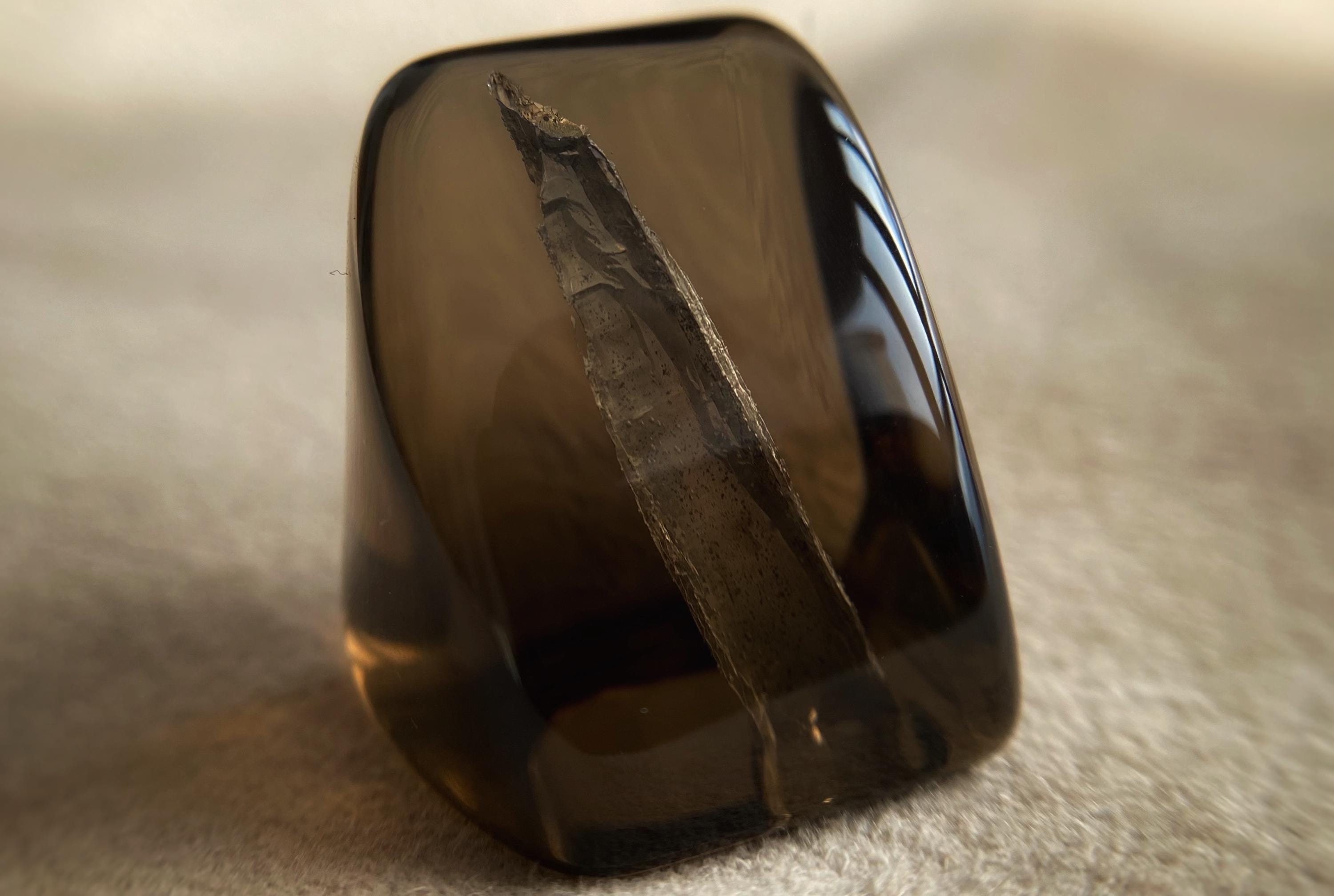 Smoky quartz from Ukraine, featuring a natural internal anomaly in the form of a crystal-shaped void that penetrates the stone from two sides.