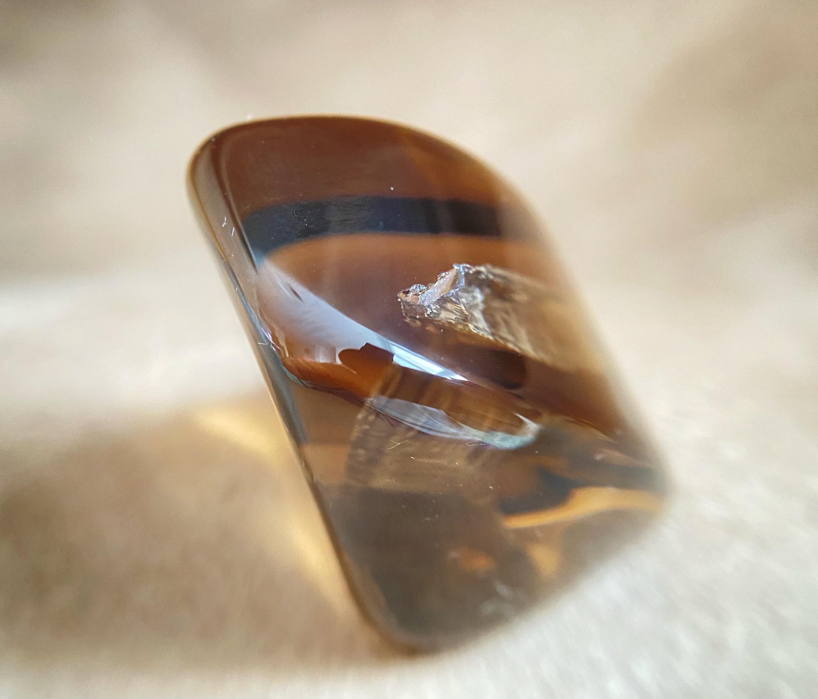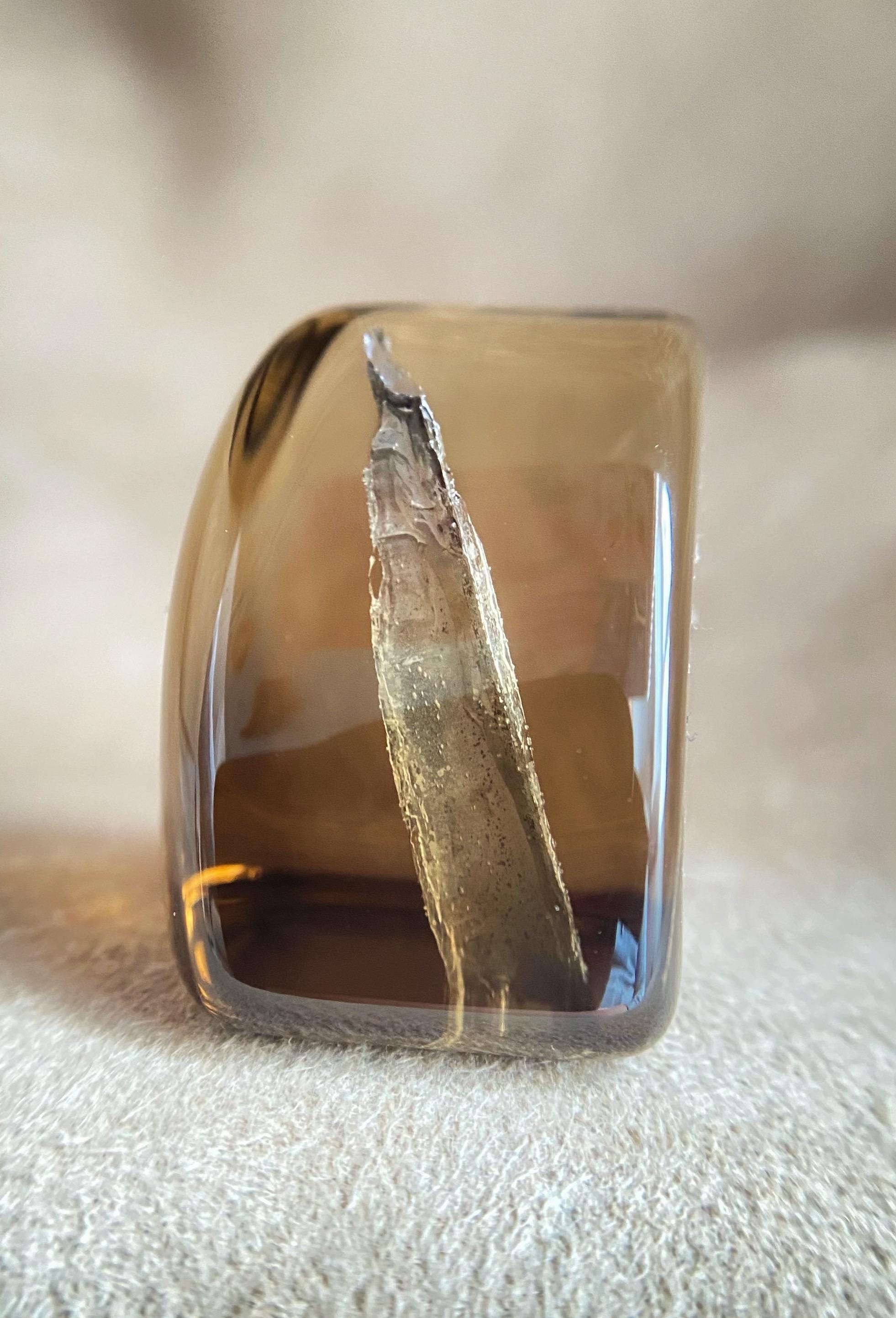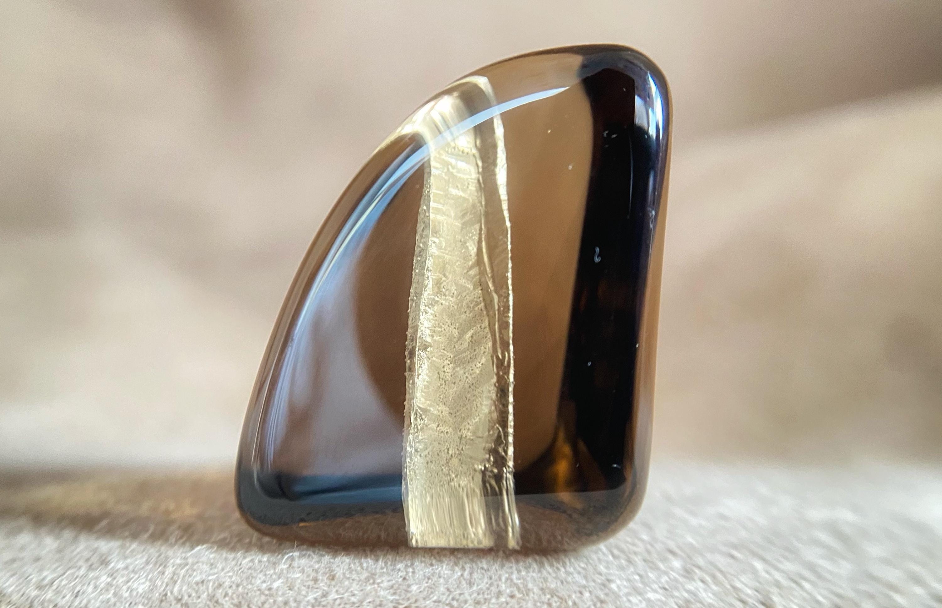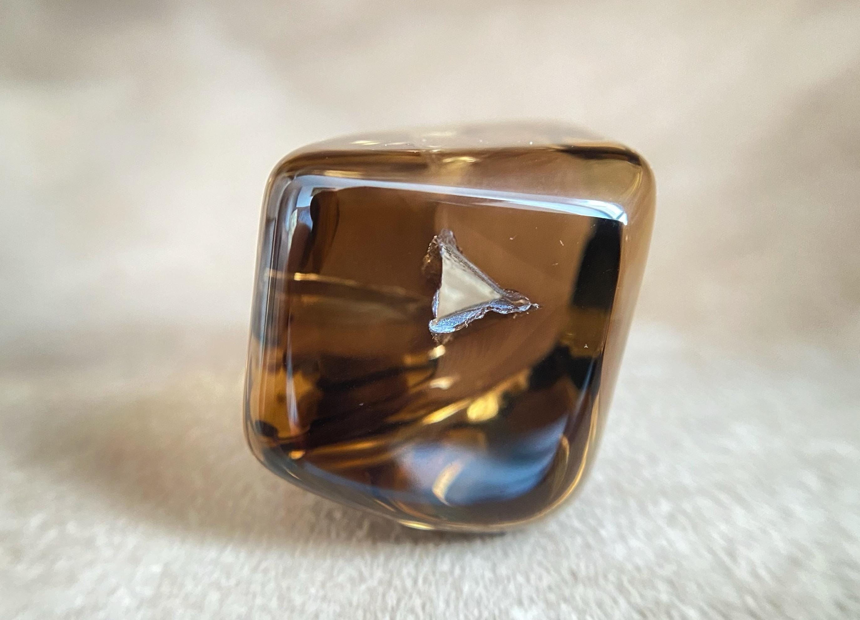 Smoky quartz from Ukraine, featuring a natural internal anomaly in the form of a crystal-shaped void that penetrates the stone from two sides.
