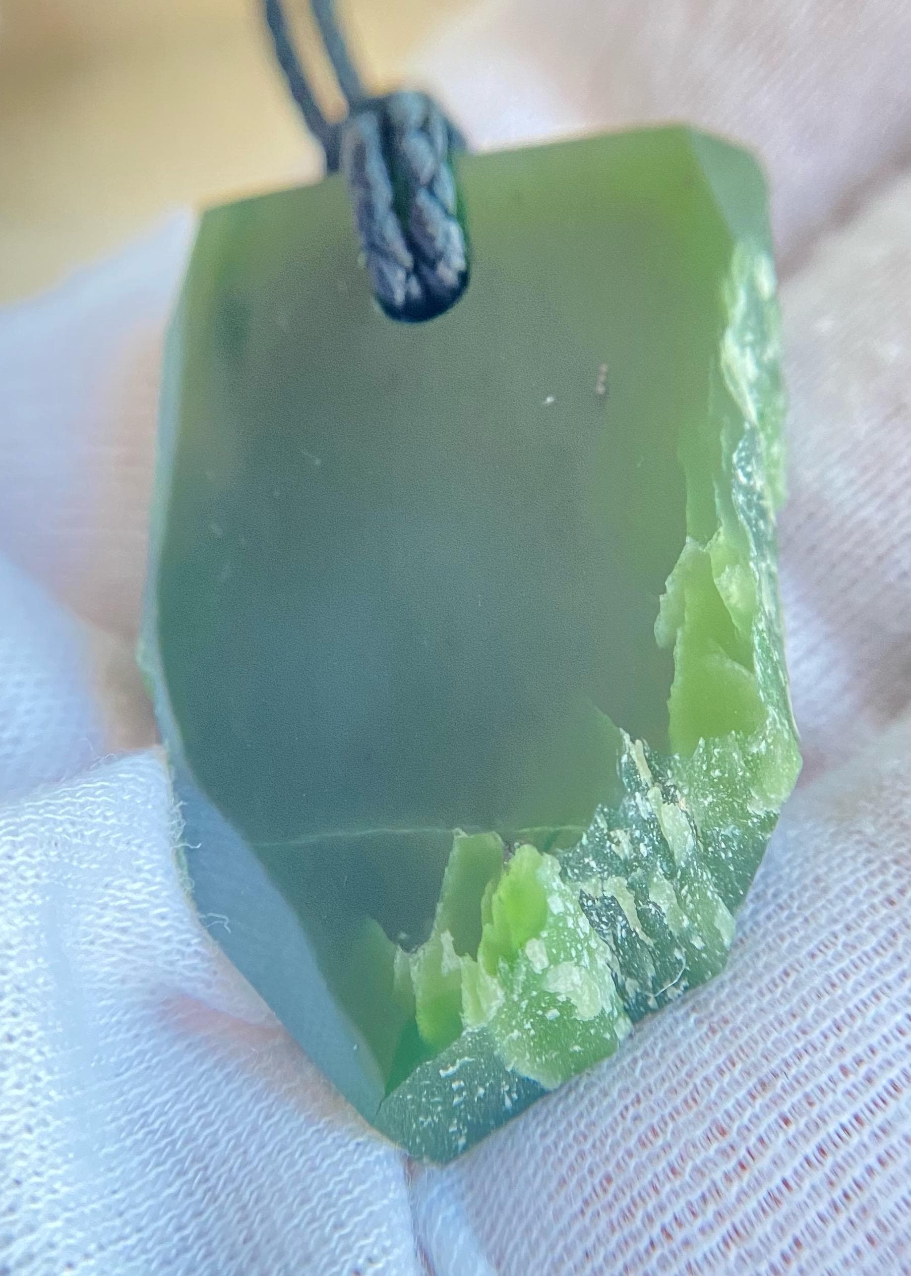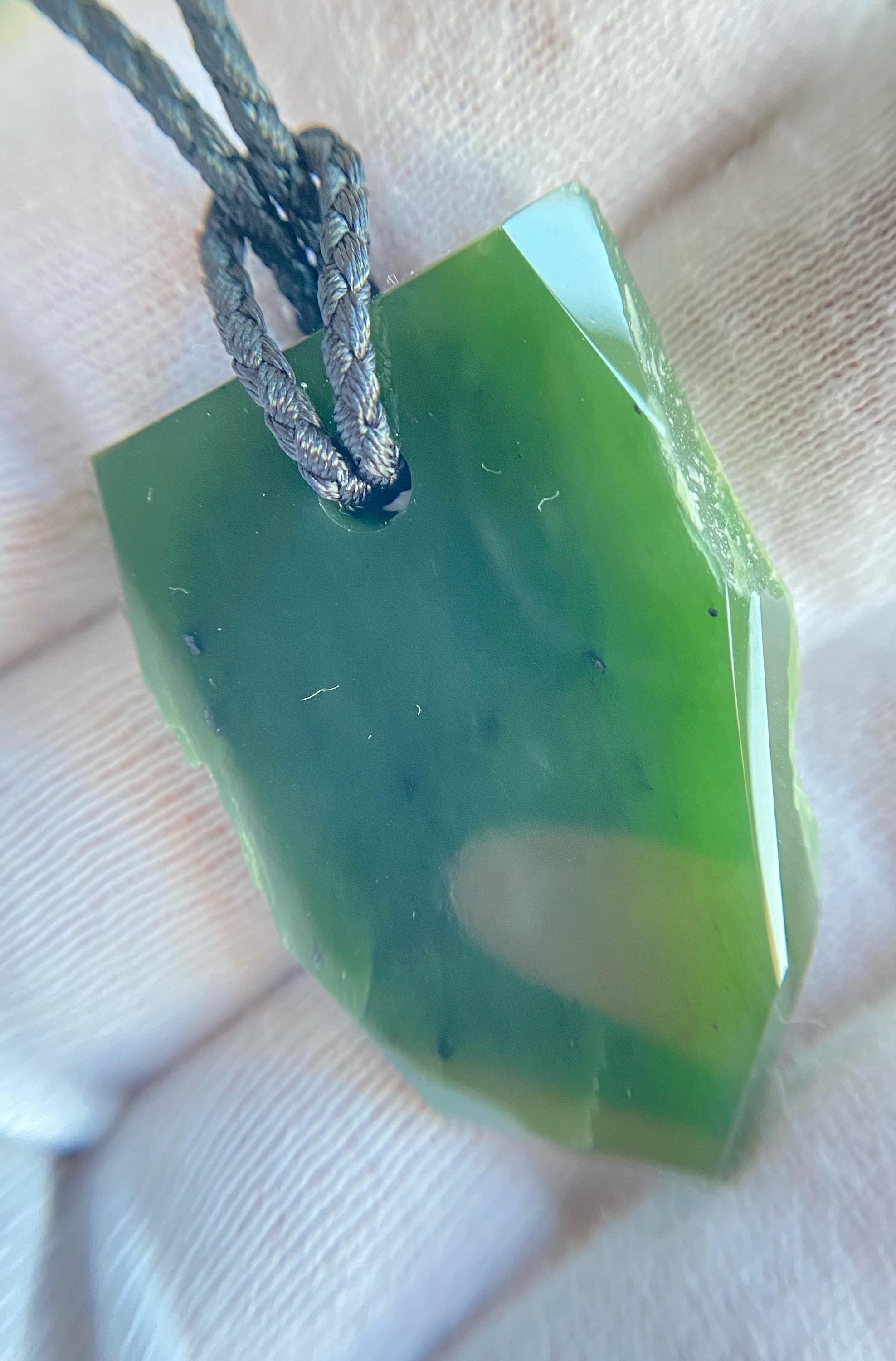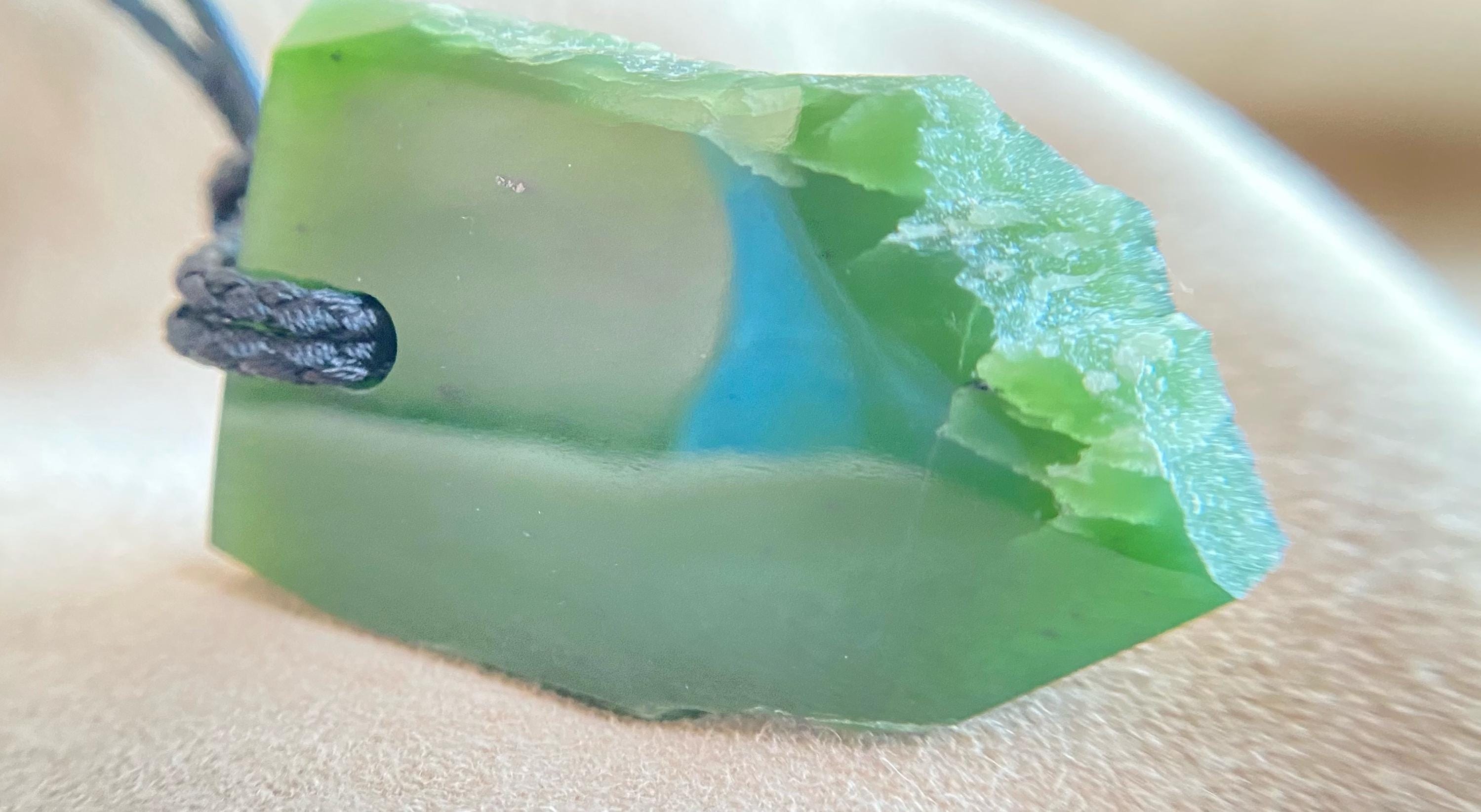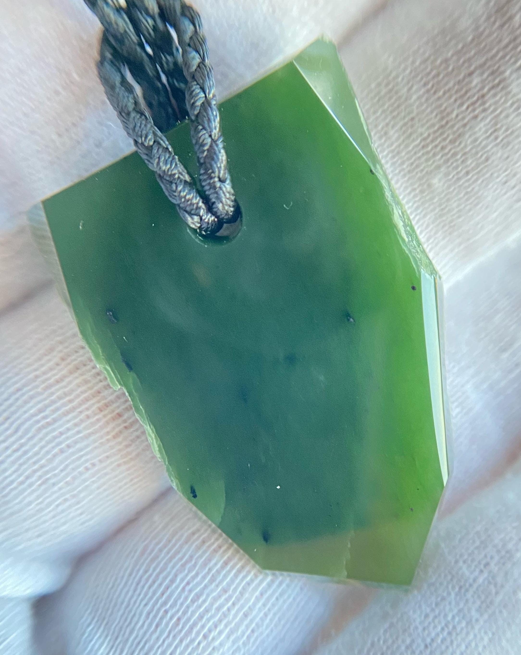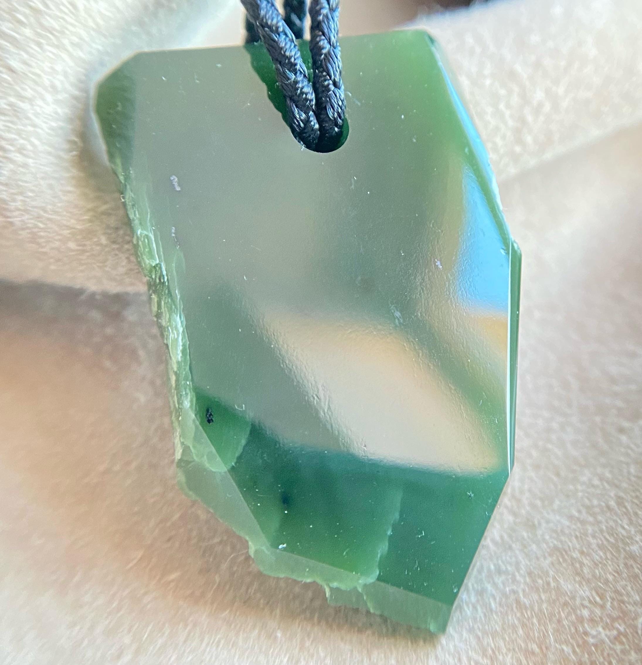 This unique amulet is crafted from natural Siberian nephrite jade, known for its strength, deep natural beauty, and historical significance. The piece preserves areas of the stone's original natural structure, giving it an organic character and highlighting the jade's authenticity.